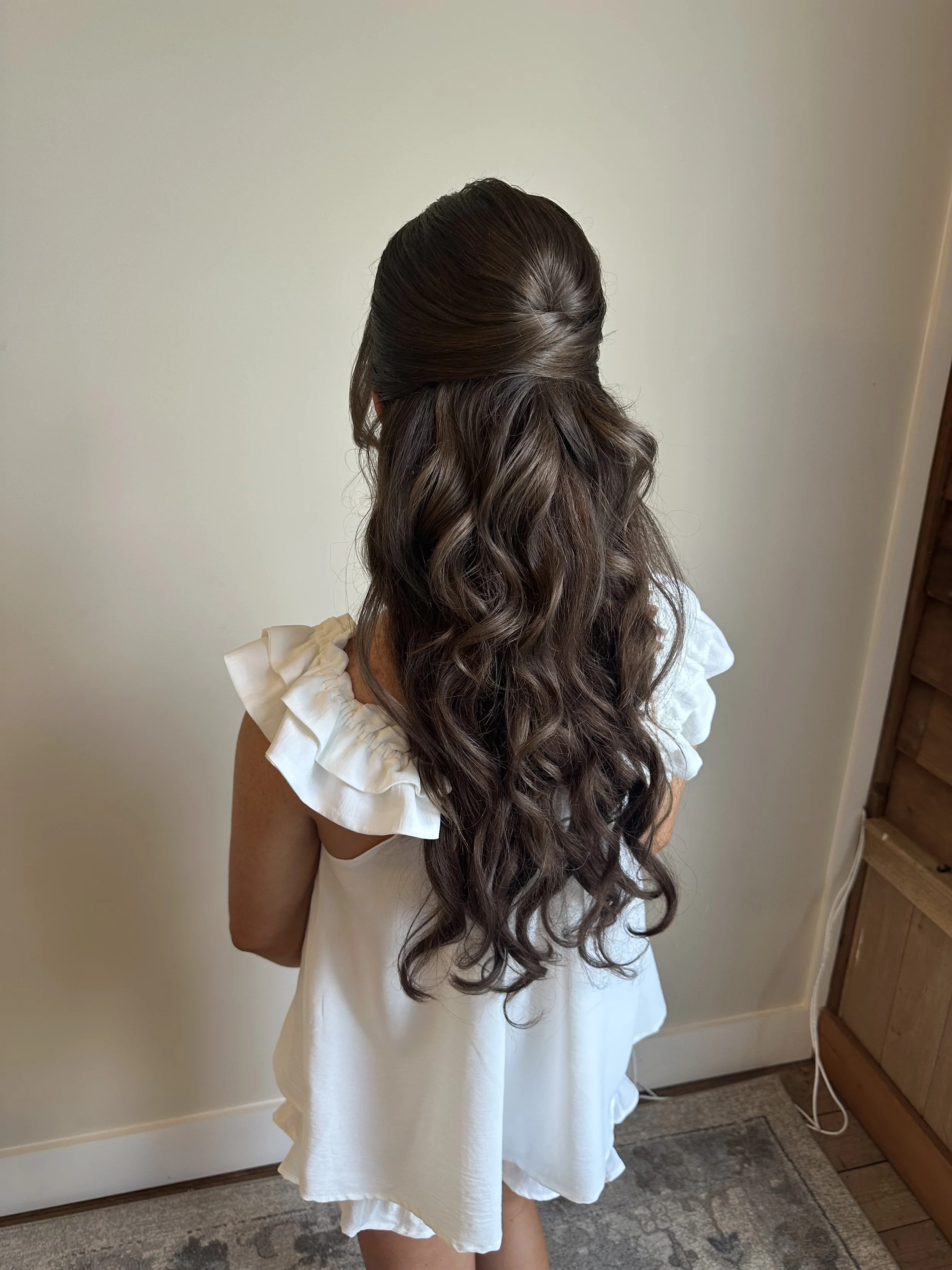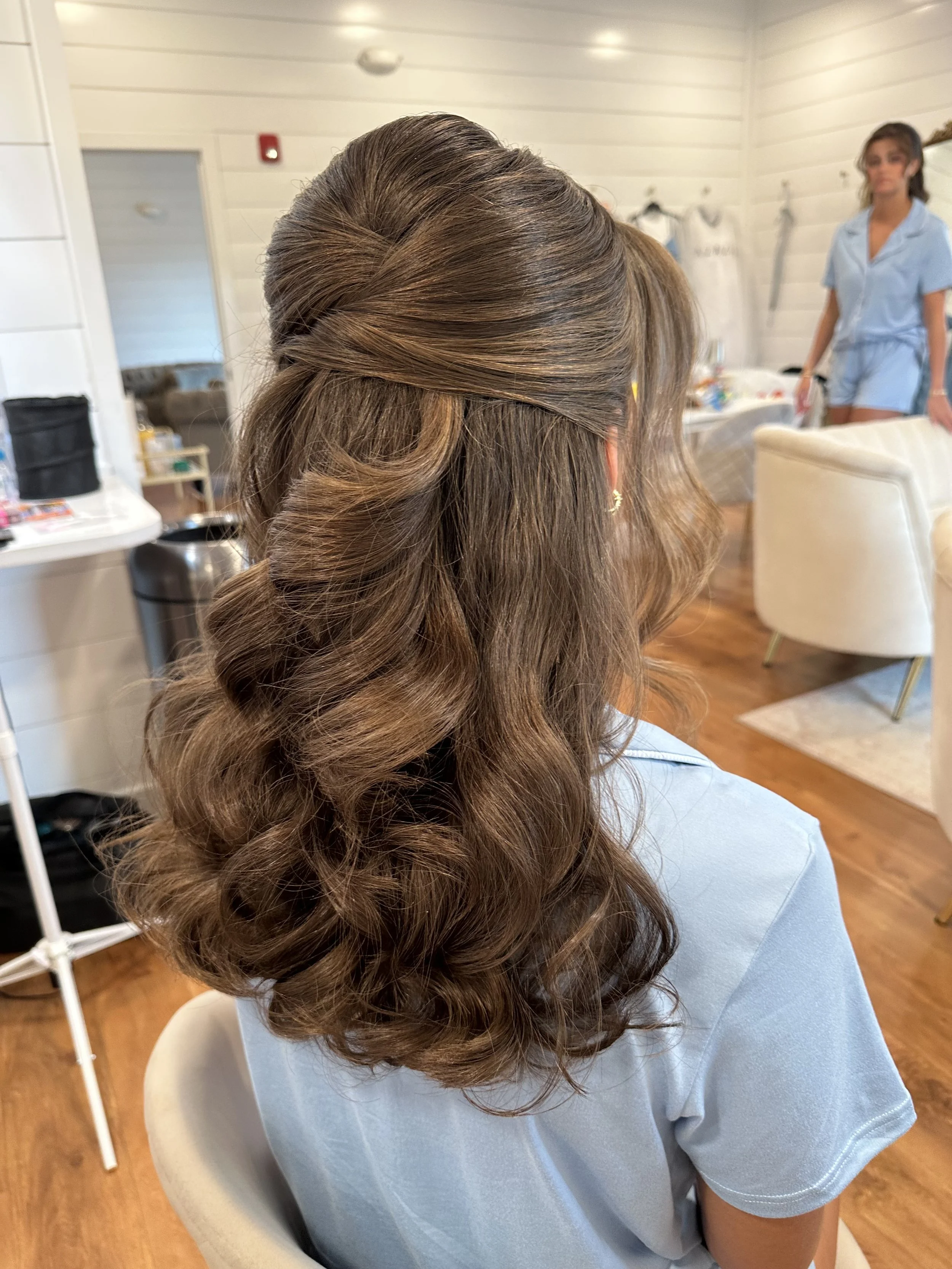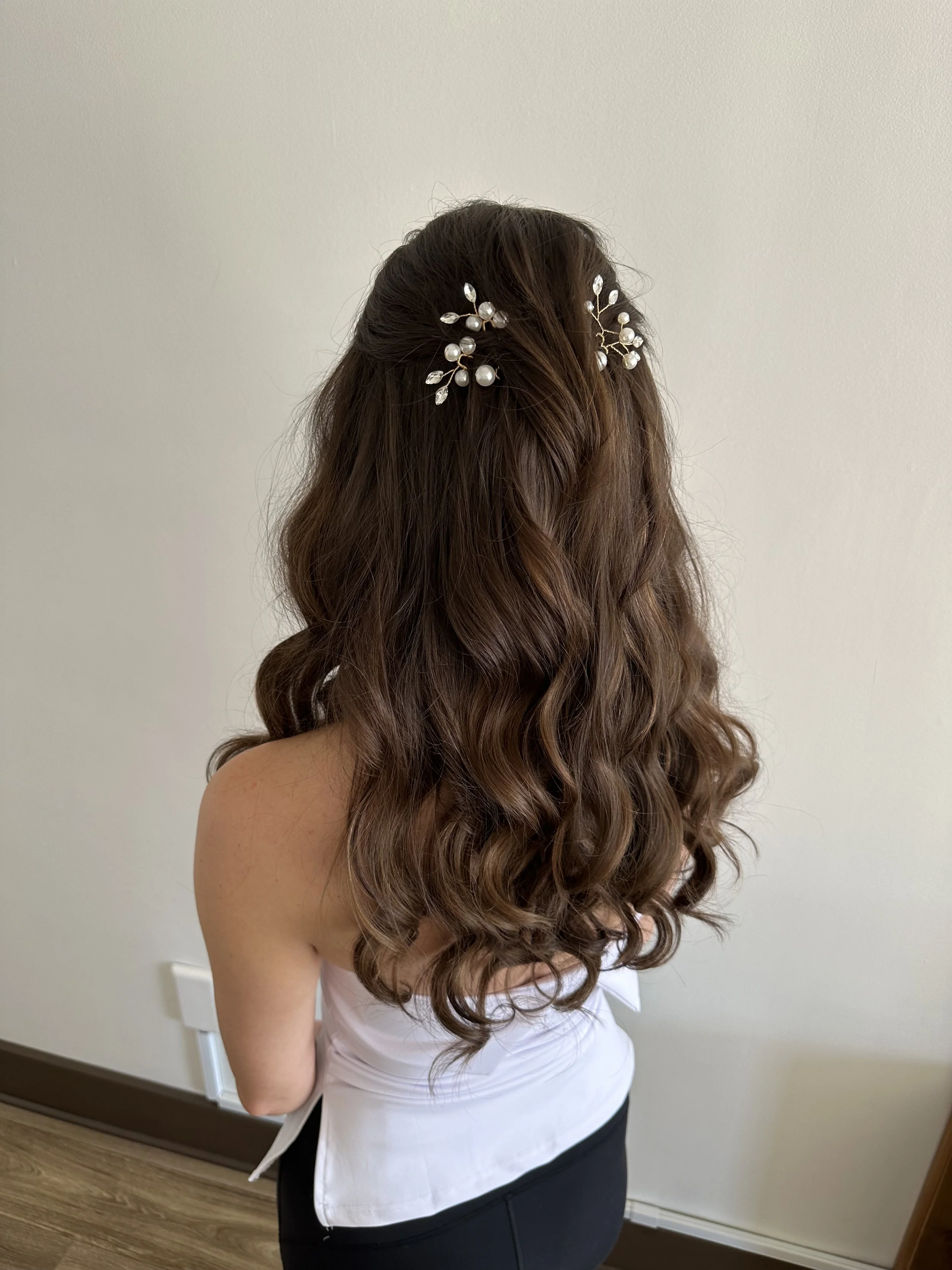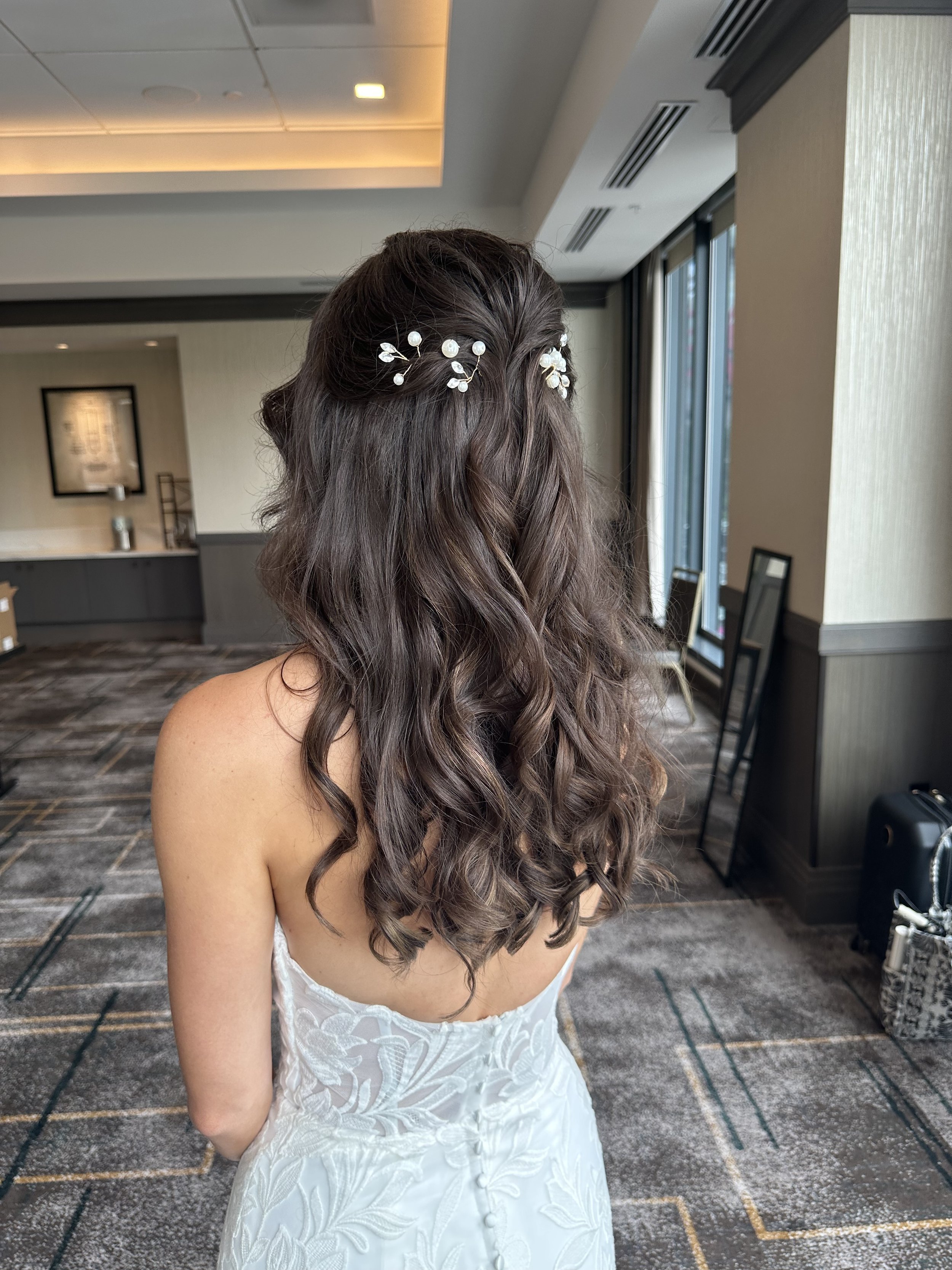 "The half-up, half-down style blends romance and elegance in perfect harmony. It keeps hair beautifully framed while allowing flowing locks to cascade naturally, creating a soft, feminine look. Ideal for brides who want the best of both worlds, this style complements veils, floral accents, or statement jewelry for a wedding day look that feels effortlessly enchanting.